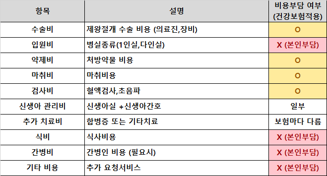 2024년 제왕절개 비용 항목