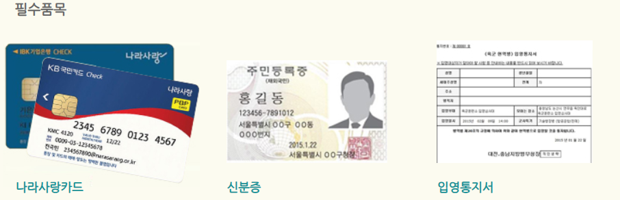 - 필수 군입대 준비물: 나라사랑카드, 신분증 등 행정 및 세면용품