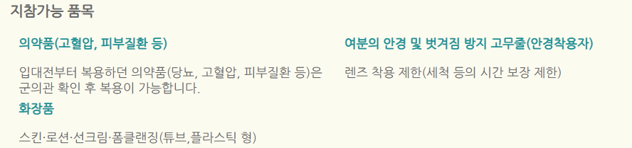 - 안경 (렌즈 착용자 포함 군대에서 렌즈는 사용못해요), 여분 안경